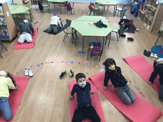 Tamén engadimos un novo espazo na aula, o renuncho da calma, onde temos distintos materiais como un par de esterillas con tarxetas con posturas de ioga sacadas do conto “Yo soy yoga”, pelotas antiestrés, xogos de emocións, botes de calma para observar e tranquilizarnos, plumas para relaxarnos pasándoas polo noso corpo...